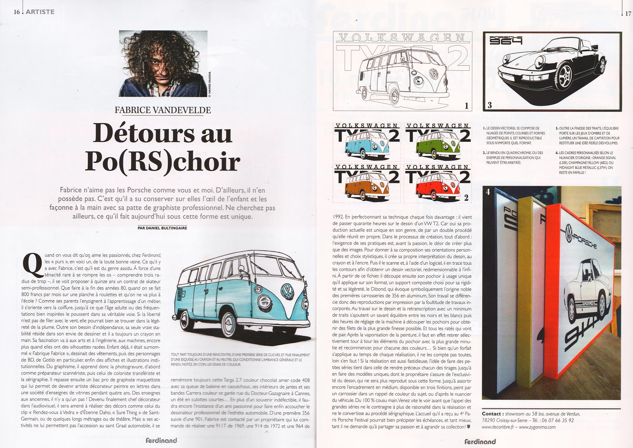 Fabrice n’aime pas les Porsche comme vous et moi. D’ailleurs, il n’en possède pas. C’est qu’il a su conserver sur elles l’œil de l’enfant et les façonne à la main avec sa patte de graphiste professionnel. Ne cherchez pas ailleurs, ce qu’il fait aujourd’hui sous cette forme est unique.